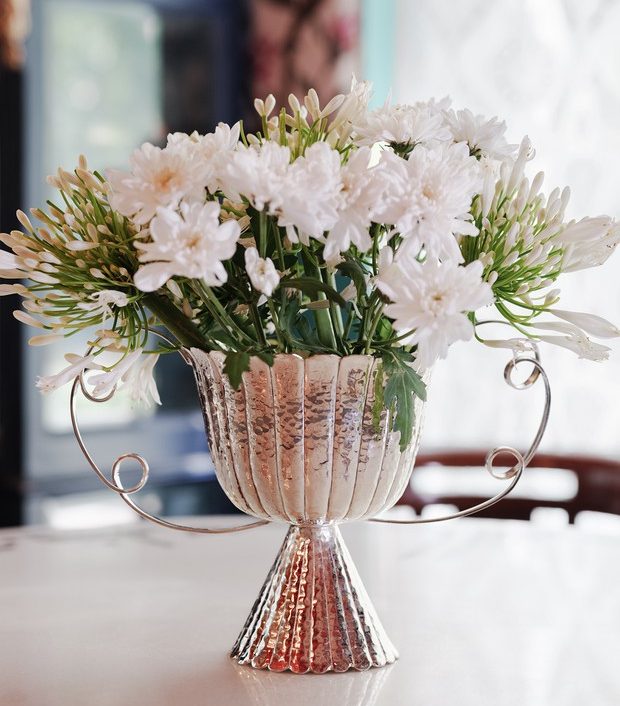 A vintage looking silver-plated decorative vase in the style of an urn, and with ornamental handles, is striking in its presence. The bold detail with silvered finish enhances it to be a standalone piece but will also look impressive as a pair. Perfect as a centrepiece for festive tables or stood proud on a tabletop, this vase is a classic that would look great in any room. Material: Hand-beaten Brass with Silver-plating. Dimensions: Length 6.75” x Breadth 12.25” x Height 8” (17cm x 32cm x 20cm) Weight: 0.750 Kg