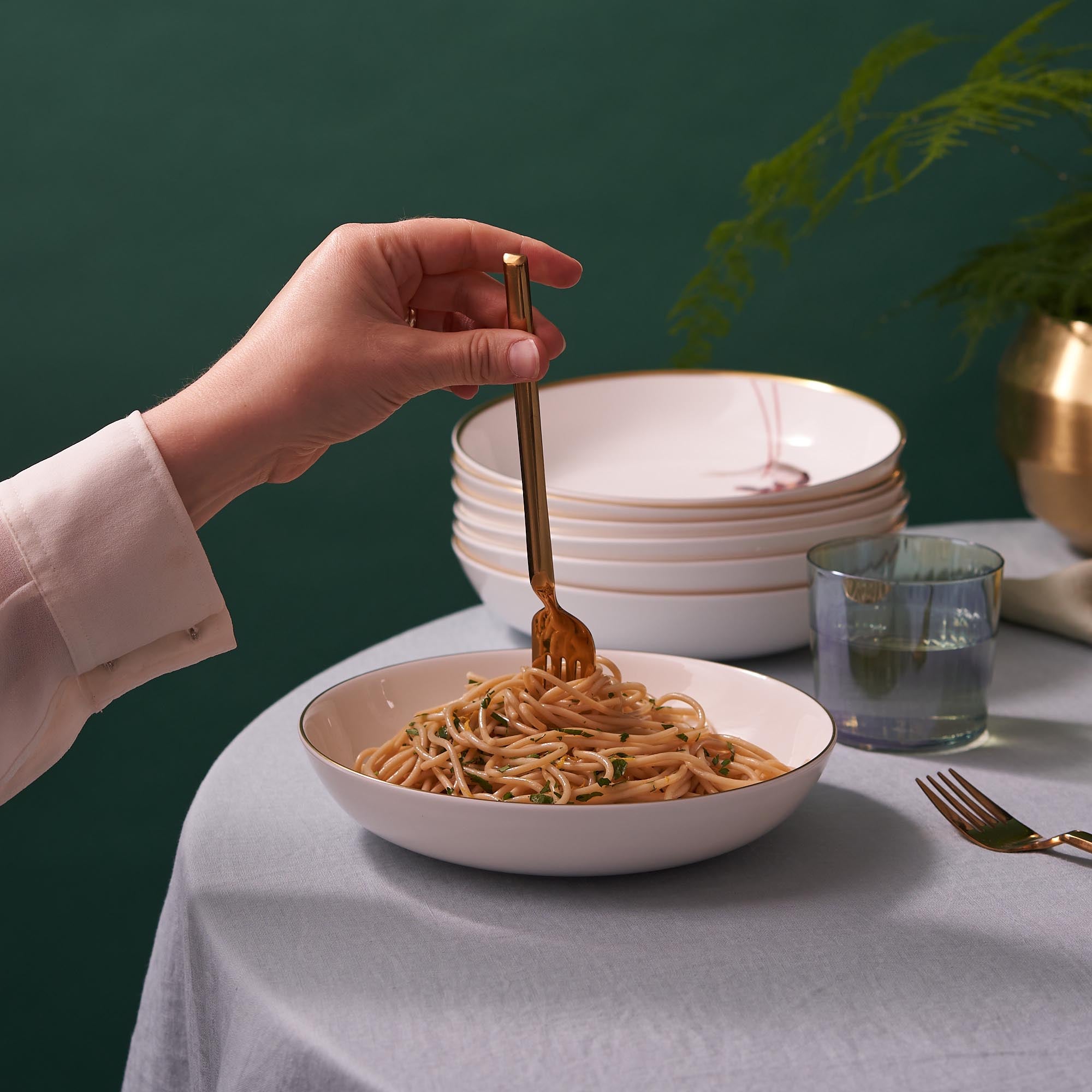 Exquisitely handcrafted fine bone china bowl from Melody Rose. The perfect size to use as a pasta bowl, lunch bowl or for soup, salad, noodle and rice dishes. The modern 20cm coupe shape bowl, is designed with versatility in mind. Features hand painted 22kt burnished gold trim for a luxurious and dishwasher friendly finish.