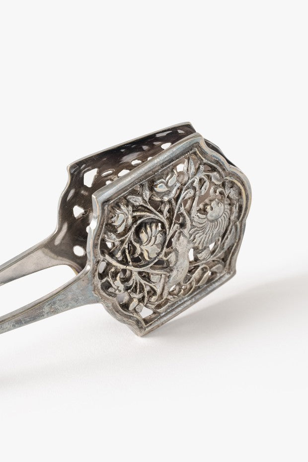 Transcend the mundane, adding style to the everyday with this refined serving accessory. Burgeoning floral motifs delicately accent both handle and tongs. Classically styled silver plated brass with intricate detailing and cast brass tongs with floral cut outs. Silver plated brass, with a mix of polished and antique finishes. Accented with fine embossed floral detailing, skillfully made by an expert craftsman.