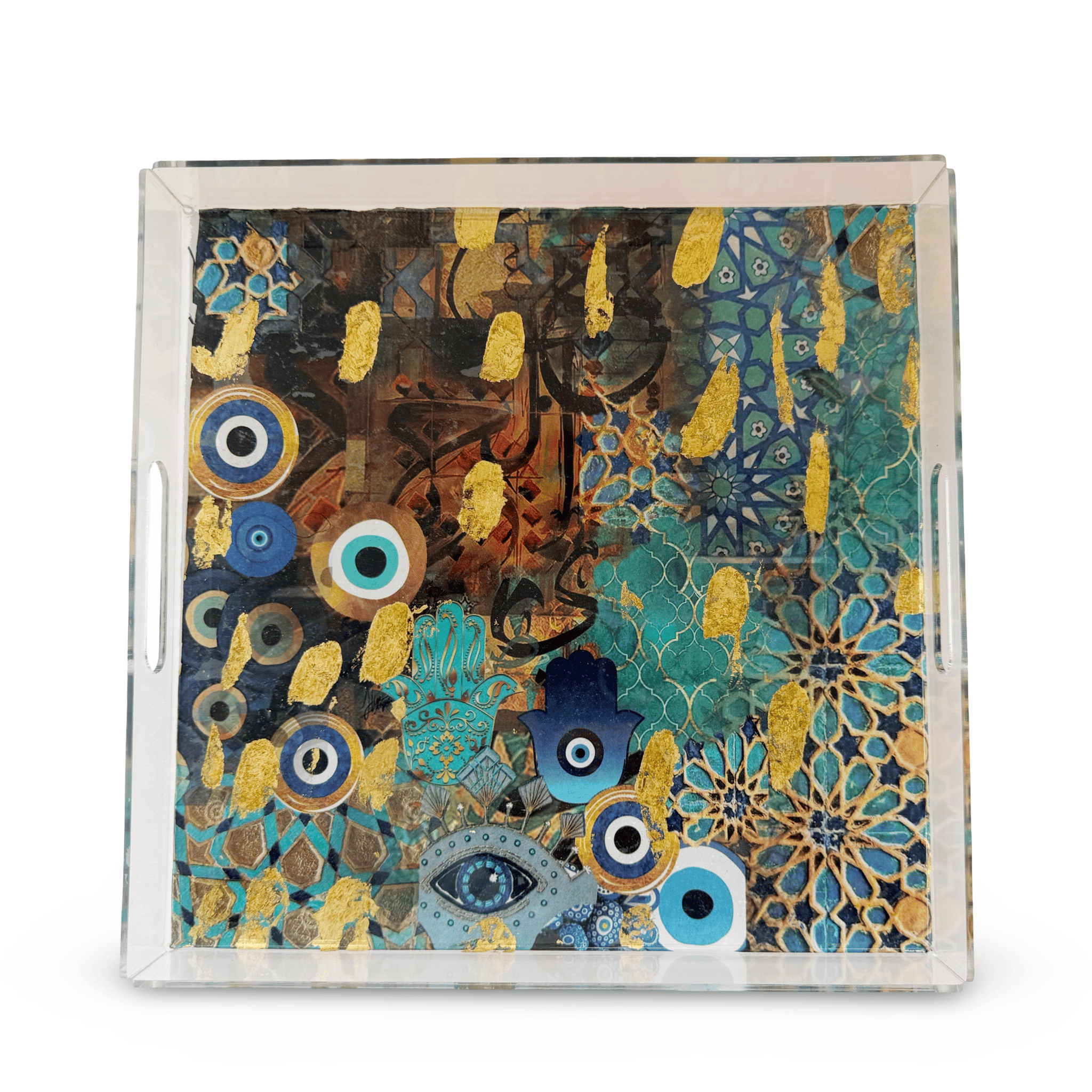 Designed by skilled artisans in Jordan, the Zoya Evil Eye Tray showcases the artistry of traditional Jordanian craftsmanship. Each tray is individually designed on premium acrylic, featuring intricate evil eye and hamsa motifs that blend ancient protective symbolism with contemporary design. The vibrant multi-colored patterns are carefully applied by hand, creating pieces that celebrate generations of artistic expertise. Because each tray is individually made, slight variations in the design make every piece uniquely yours—no two trays are exactly alike.