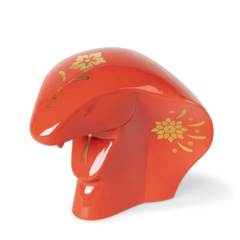 According to the Chinese zodiac, the Snake symbolizes wisdom, intuition, and charm. And, from a spiritual viewpoint, transformation, and rebirth. This version, handcrafted in porcelain, boasts a conceptual design with very simple lines combined with a decoration in deep red tones and touches of golden luster.