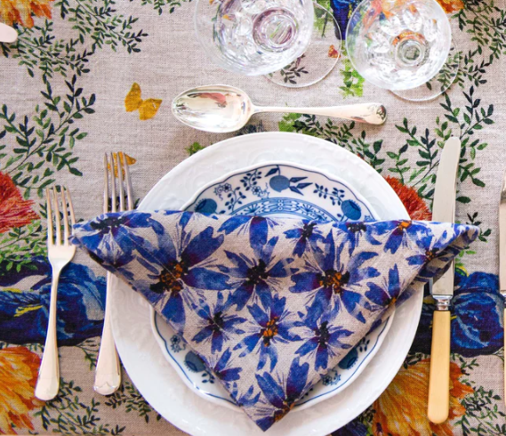 Our beautiful blue flower print 'Blue Harem' is an all-round talent. A great pattern for the kitchen or for outdoors but also for an elegant occasion. The linen feels beautiful to the touch and the floral pattern adds the perfect pop of color to any table.